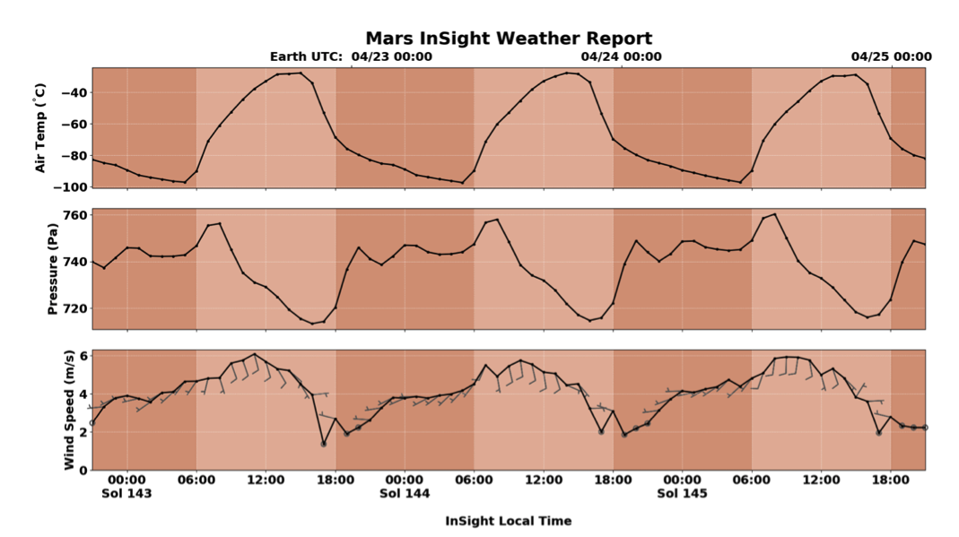The fact that the InSight instrument ensemble contains a highly sensitive pressure sensor (PS), and temperature and wind detectors (TWINS), combined with the radiometer (RAD) instrument, which will measure the surface brightness temperature, and a camera with multiple filters (IDC), which can be used to quantify atmospheric opacity, provides the components for an effective weather station. This weather station provides a more continuous and higher-frequency record of pressure, air temperature and winds at the surface of Mars than previous in situ missions.