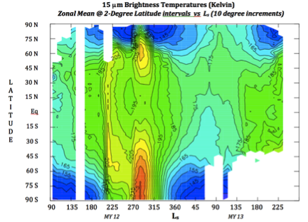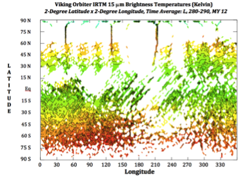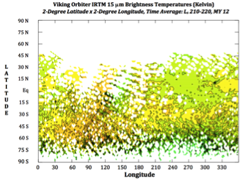Atmospheric "T15" temperatures (15 μm brightness temperatures) were derived from Viking Orbiter IRTM measurements. The two maps on the left were averaged over 10 degrees of Ls, 210-220 and 280-290, MY 12 for 2-degree latitude by 2-degree longitude bins. A more seasonal representation of T15 in the form of zonally (longitudinally) averaged T15 over 10 degree Ls time increments for the duration of the Viking Orbiter mission, Ls 90 MY 12 through Ls 235 MY 13 is shown on the right. All available times of sol are included in these averaged temperature values, but sampling is not necessarily uniform, nor is the spatial coverage (as illustrated by the maps above).