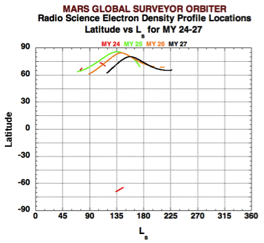 Above are shown examples of the MGS Radio Science derived electron number density profiles derived from radio science occultation measurements of the martian atmosphere (left two figures). The 5600 profiles within the archive span the time period from late December 1998 (Ls 74, MY 23) through early June 2005 (Ls 227, MY27). The latitudes of these derived profiles as a function of Ls are shown in the figure on the right above.