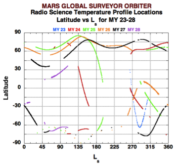 Above are shown examples of the MGS Radio Science atmospheric temperature profiles derived from radio occultation measurements (left figure), as well as an indication of the latitude locations of all 21243 MGS Radio Science derived vertical temperature profiles (right figure above). MORE TEXT HERE measured spacecraft deceleration during an aerobraking drag pass. For each drag pass (spanning orbits 18 - 445 of the mission) there is an individual ASCII PROFILE file containing derived density values at 1-second intervals for a time period spanning several hundred seconds centered upon the periapse time. There is also a separate ASCII ALTITUDE file which provides derived density and scale height values at specified altitudes (100 km, 110 km, etc.) for both the inbound and outbound portions of the orbit/drag pass as well as at the periapsis altitude, and 1.26 nanobar pressure level during both the inbound and outbound portions of the orbit/drag pass.
