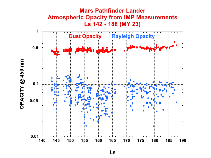These atmospheric opacities were derived from images of the sun obtained with the Imager for Mars Pathfinder (IMP). The filter set allowed opacities to be obtained at 450, 670, 883, and 989 nm. The goal was to derive the average daily opacity and its wavelength variation. These atmospheric opacities were derived from images of the sun obtained with the Imager for Mars Pathfinder (IMP). The filter set allowed opacities to be obtained at 450, 670, 883, and 989 nm. The goal was to derive the average daily opacity and its wavelength variations.