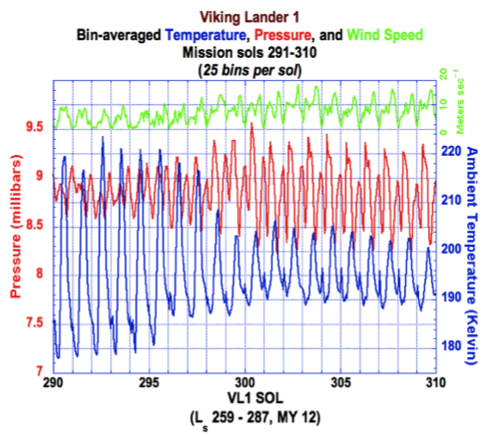 The above plot shows data obtained during a 20-sol interval of the Viking Lander 1 mission during which the 1977b global dust storm developed are shown on the plot above. Each 'bin' spans 1/25th of a martian sol, and thus represents a bit less than one hour of data.