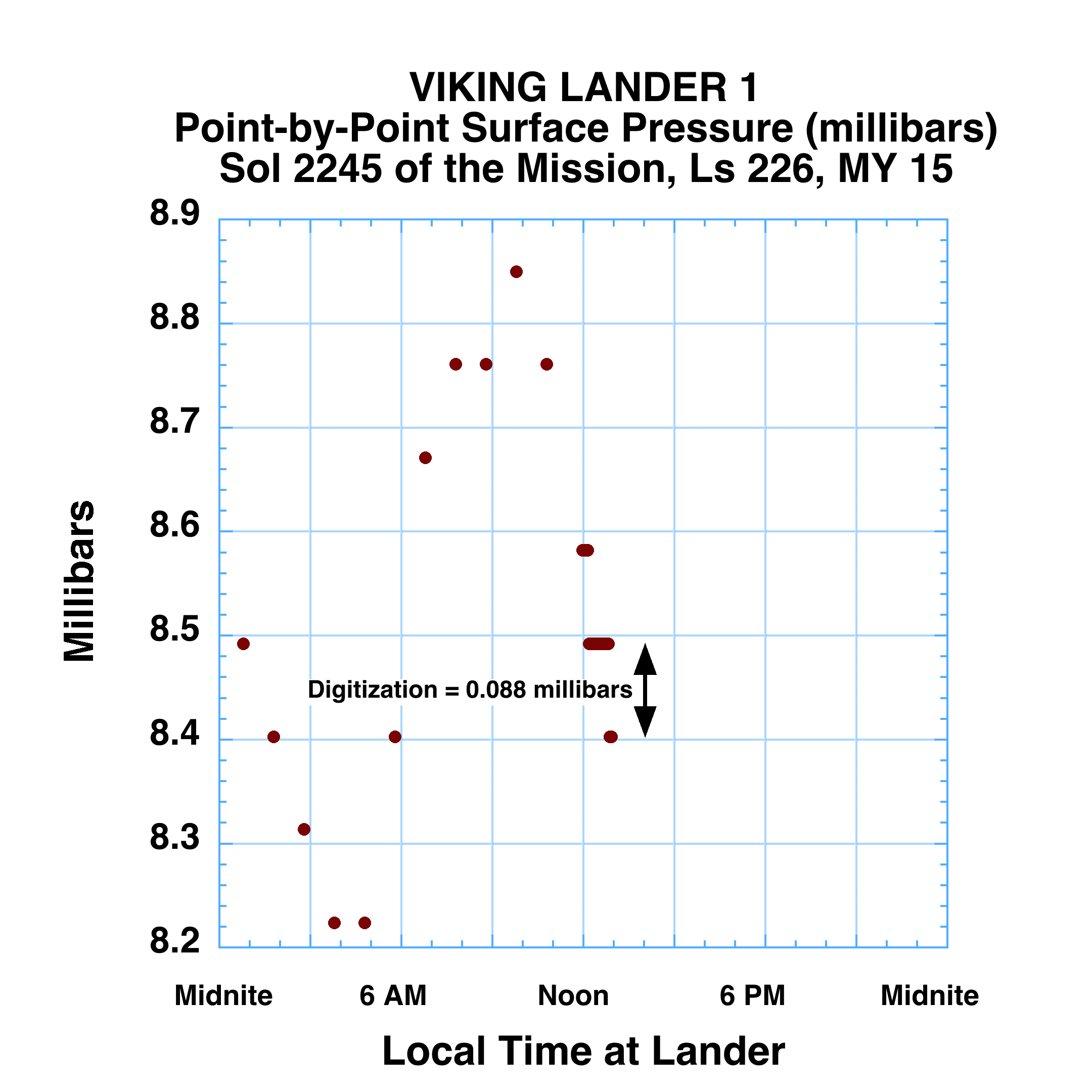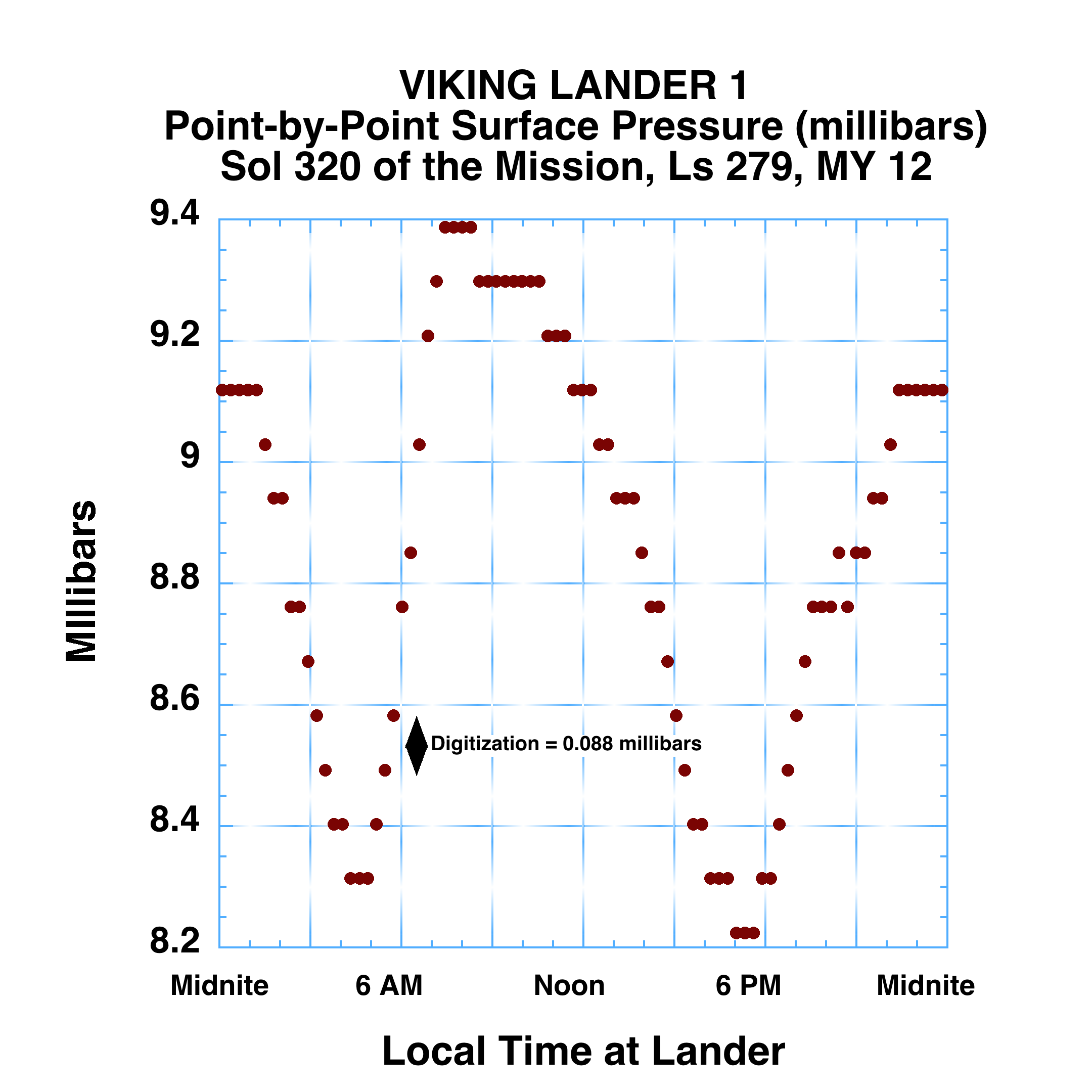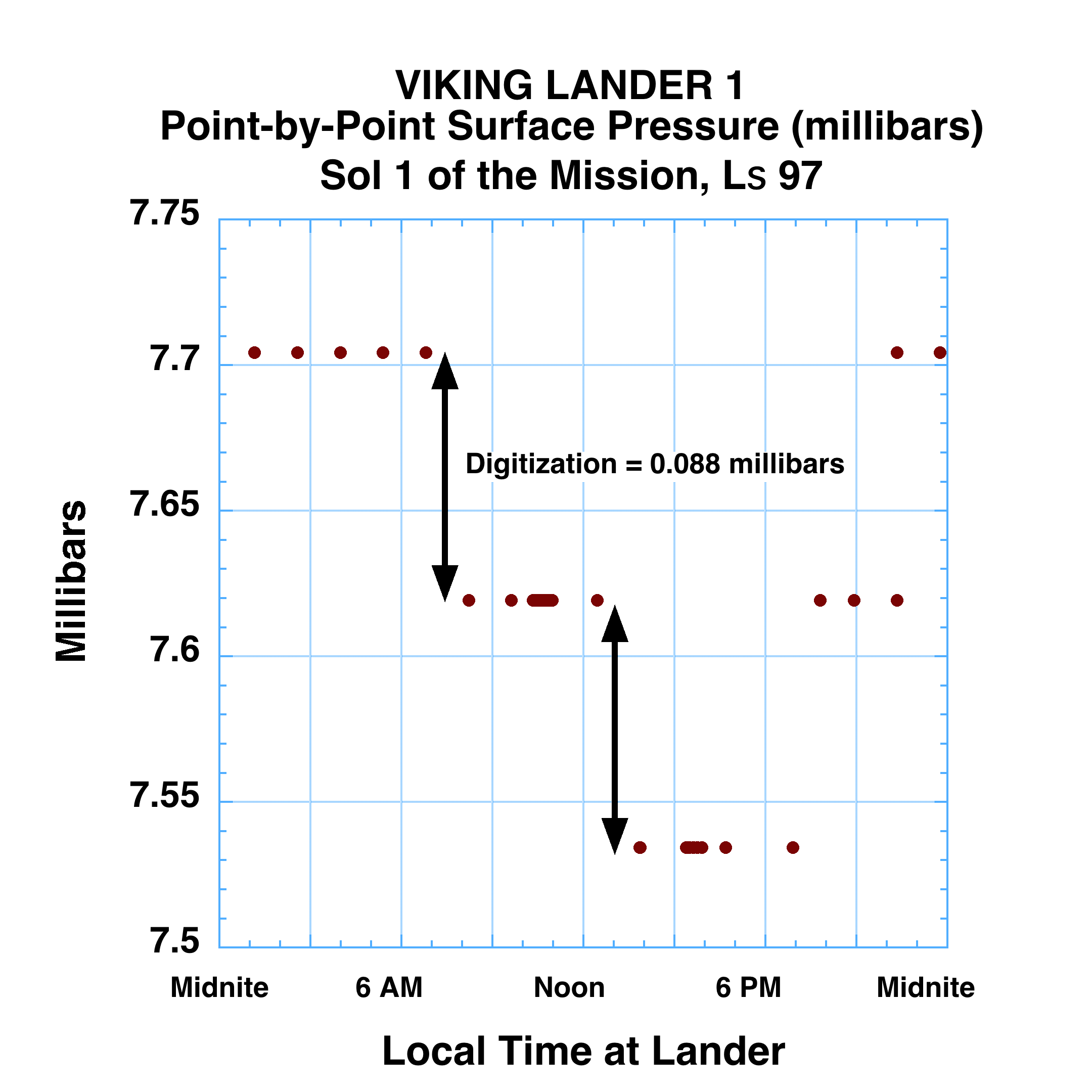 These plots are examples of the point-by-point surface pressure measurements obtained by the pressure sensor on the Viking lander during 3 sols of the 2245 sol mission on Mars. Pressure measurements were not obtained continuously during the mission. The time-between-measurements ranged from ~1 second (though there are few instances of such frequent sampling) to tens of minutes. There are time intervals spanning hours or sols when no pressure measurements were obtained.