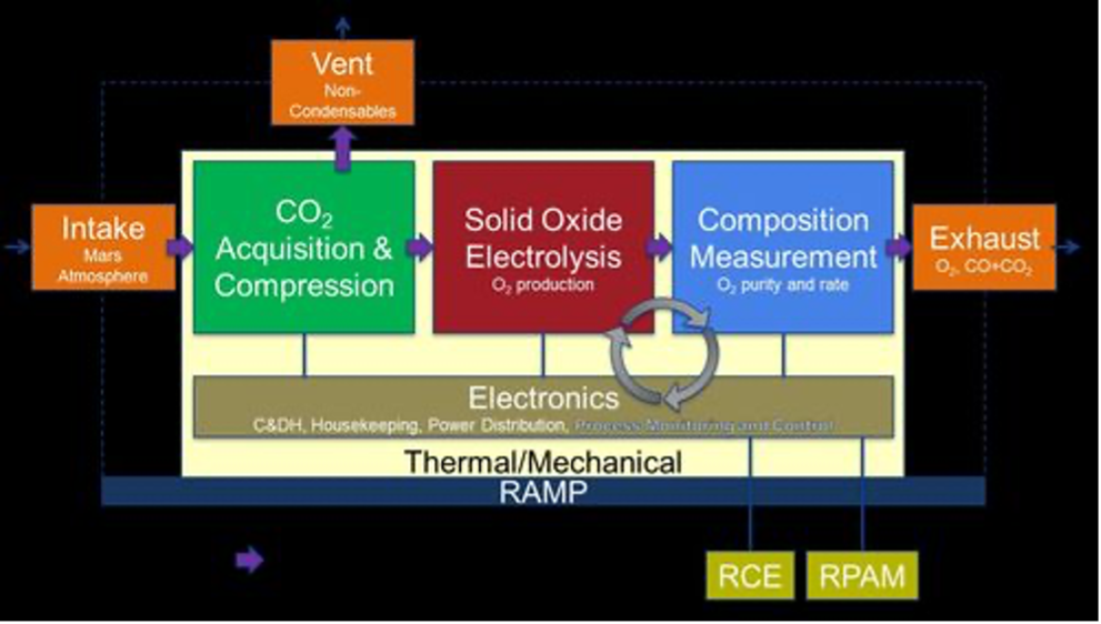 Based on conversion efficiency calculated from flow rates and composition measurements, SOXE control parameters such as CO2 input flow rate, temperature, and applied voltage are used to optimize O2 production under Mars environmental conditions. The cooled exhausts are then filtered to satisfy planetary protection requirements and vented from the Rover. Process telemetry is reported to the Rover for downlink.